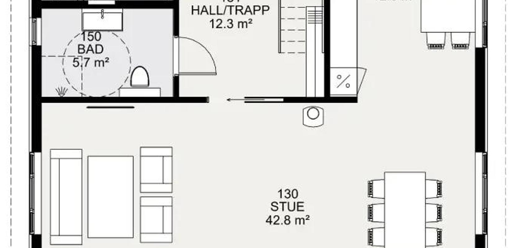 Hovedinngangen leder inn til en romslig hall. Fra hallen finner du vaskerom og bod lett tilgjengelig, et bad og trapp opp til andre etasje. Herfra trer du også inn til husets romslige oppholdssone med stue og kjøkken.